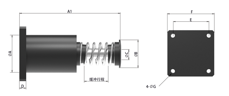 安裝要求:緩沖行程在300mm以內(nèi),較大允許側(cè)負(fù)荷角度為2.5°;緩沖行程為300mm以上,較大允許側(cè)負(fù)荷角度為1°;確保螺栓螺母鎖緊牢固,建議使用螺紋膠。